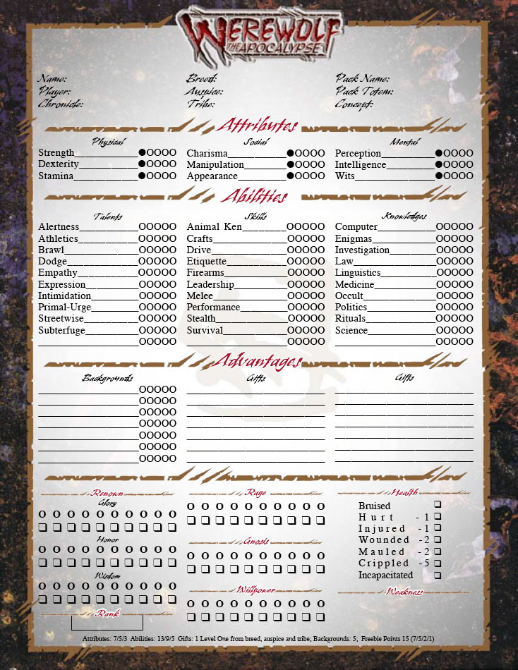 The World of Darkness sheets look just like the official versions. Are your's different? White Wolf did an uncommonly good job of designing their character sheets, so I had to make very few changes. My versions simply add color and spice things up a bit, with small revisions here and there. The 20th Anniversary sheets actually have the most revisions, not including the Werewolf the Forsaken sheet, which was a complete redesign (done mostly just for fun). Many of these were made from White Wolf's original graphics and fonts from when I served as an intern there.